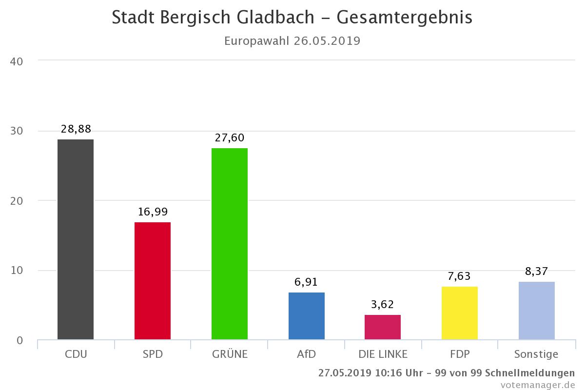 Knapp über dem Kreisschnitt liegt die Wahlbeteiligung in Bergisch Gladbach. 68.29% der Bergisch Gladbacher Wahlberechtigten haben ihr Recht zu wählen am Sonntag genutzt.