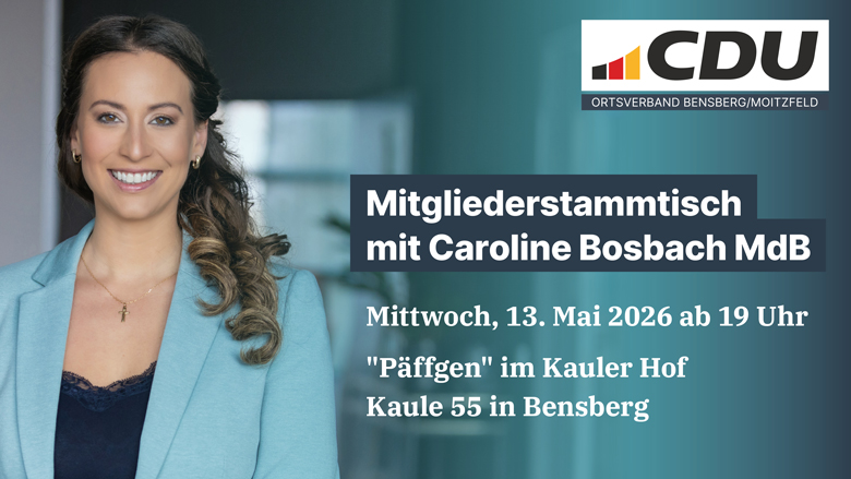 Der CDU-Ortsverband Bensberg/Moitzfeld lädt alle Mitglieder sowie interssierte Bürger/innen zu einem Mitgliederstammtisch ein.